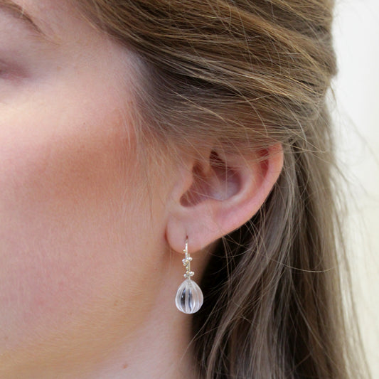 Drops of dew, bergkristal oorbellen zilver en goud