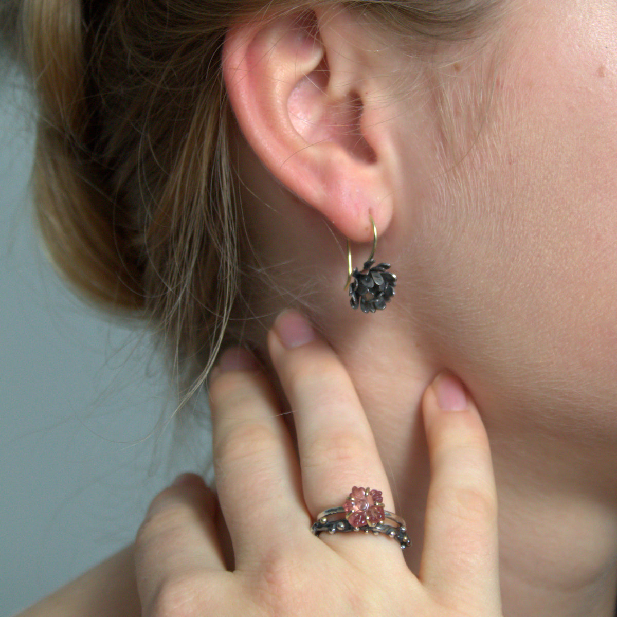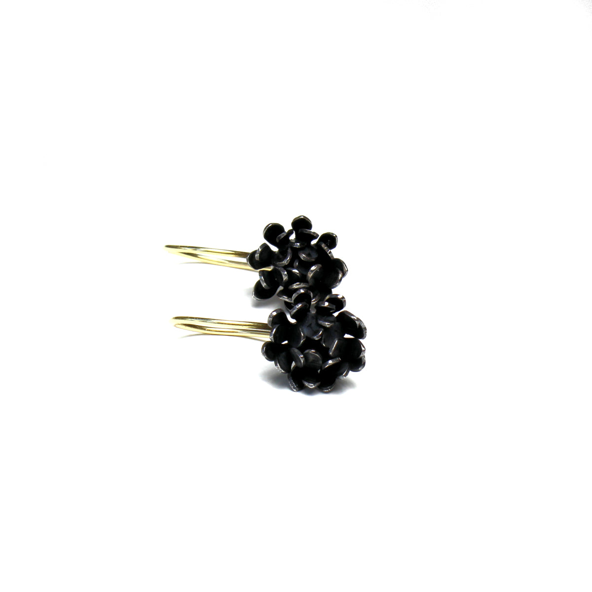 Oorbellen met een geoxideerde zilveren chrysant bloem. De haak is van 14 karaat goud wat een mooi contrast vormt met het gezwarte zilver. De oorbellen hangen net onder het oor. Chrysant is een bloem die staat voor geluk en voorspoed.