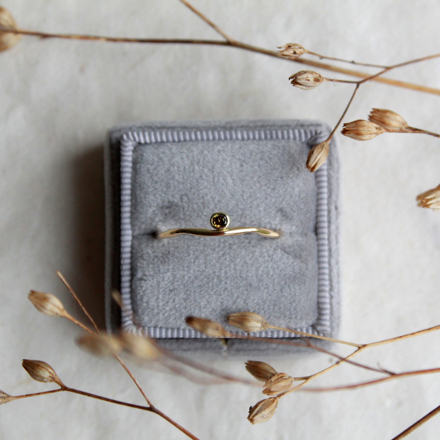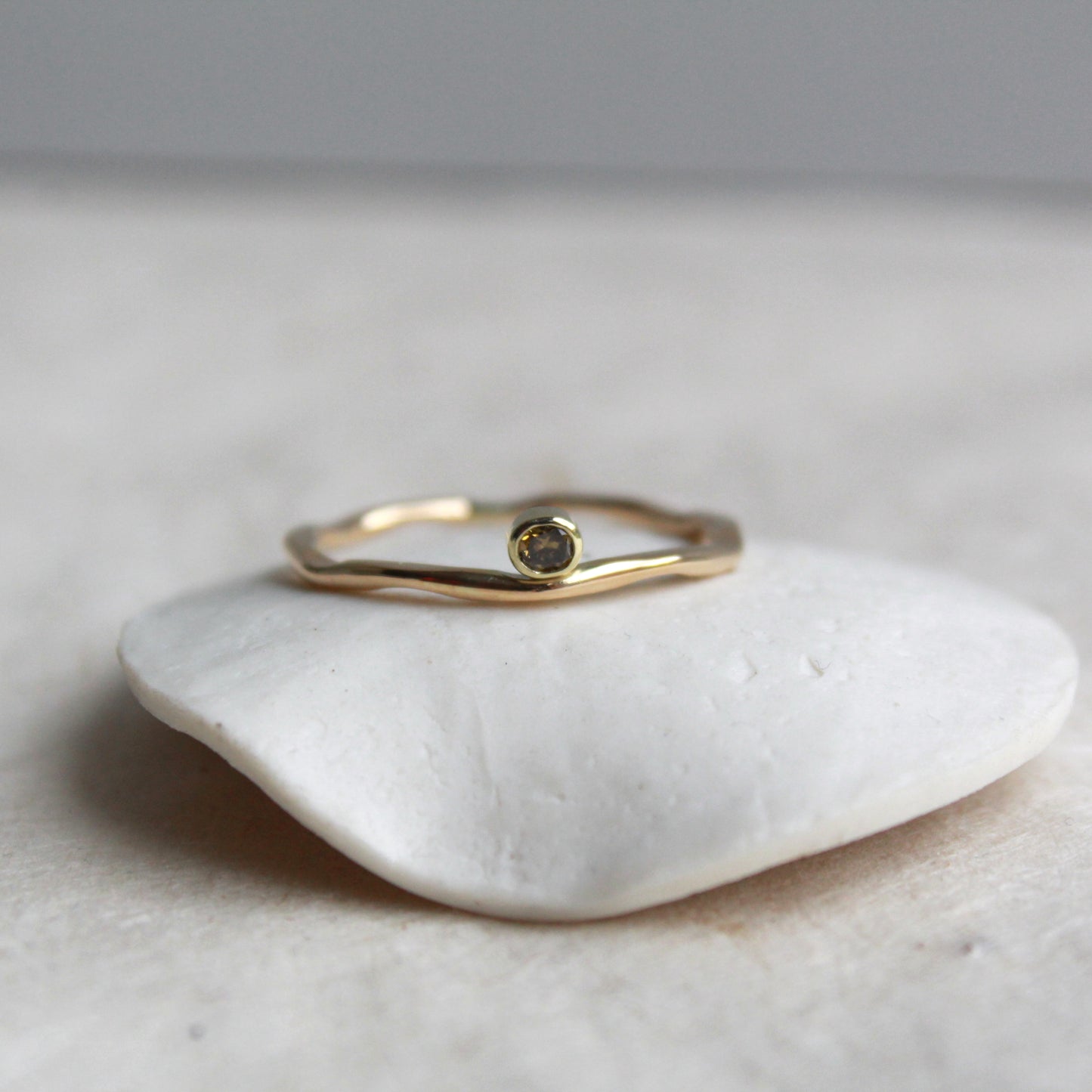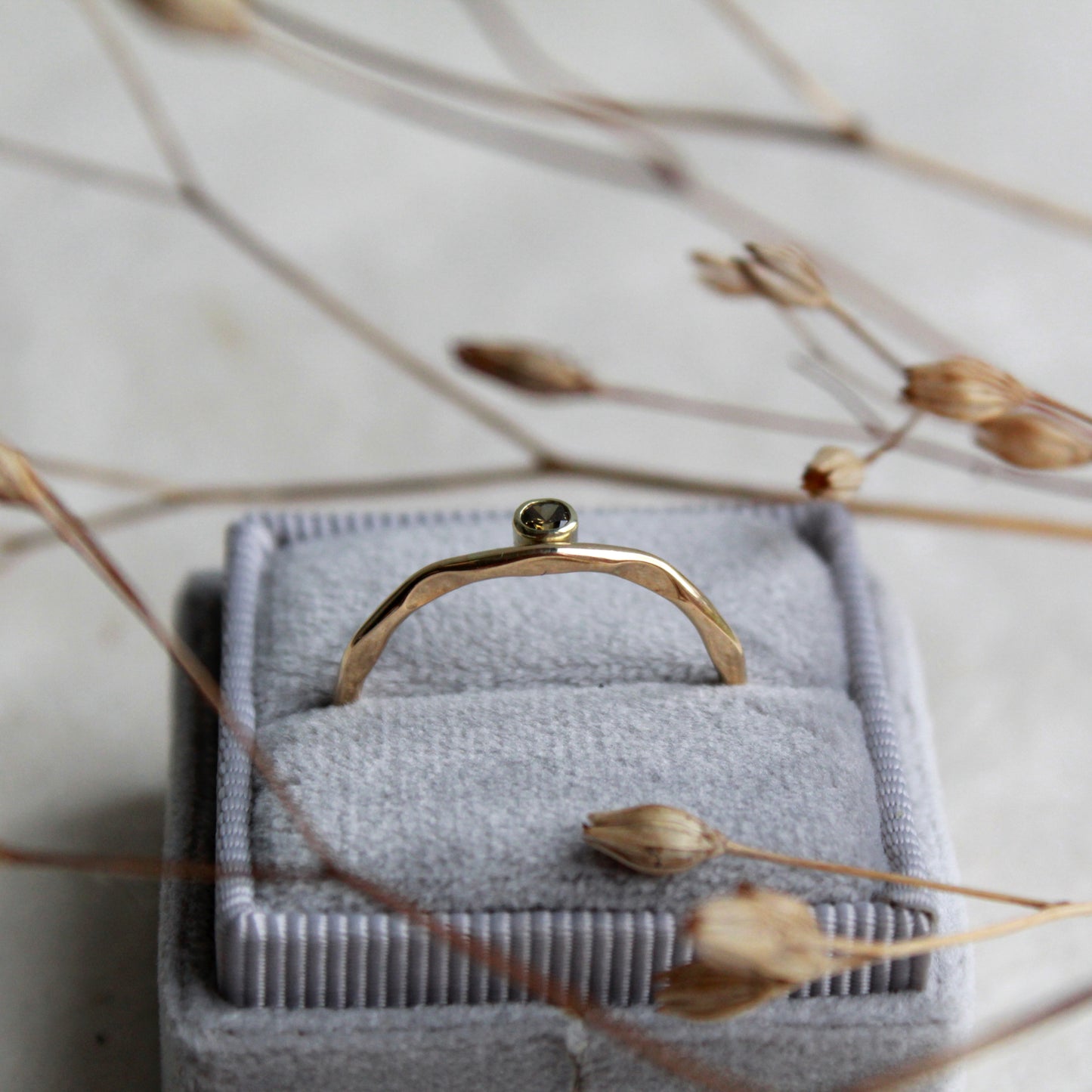Een smal 14 karaat gouden ringetje die als een dun lintje om je vinger past. Ook erg romantisch als kleine verlovingsring of om je wijsvinger. Deze ribbon heeft een groen/bruine diamant gevat in een kastje van goud. Hoewel de ring teer oogt is hij sterk door de bewerking en zal niet verbuigen.